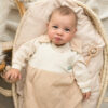 A baby sleeping bag for sweet dreams. The fluffy sleeping bag will keep your baby snug and warm in its sleep. It will always be well covered, no matter how often it turns in its sleep. Our baby sleeping bag features a zip which is concealed for safety. Popper fastenings on the armholes ensure that the armholes don’t slip down whilst the baby is sleeping. 2 rows of poppers allow you to adjust the size of the baby sleep bag at the shoulders. The full-length zipper has a scratch protection on the inside. Suitable for winter and summer: your little one will sleep at the correct temperature all year round. The natural material is breathable and thermoregulating to keep your little one at the perfect temperature. Ideal newborn sleeping bag. The outside is made of natural organic cotton. Without chemical dyes or bleaches! Ideal for babies with very sensitive skin that is prone to skin rashes. Cotton certified according to Organic Content Standard 100. Filling made of 100% recycled polyester wadding. Easy to clean.